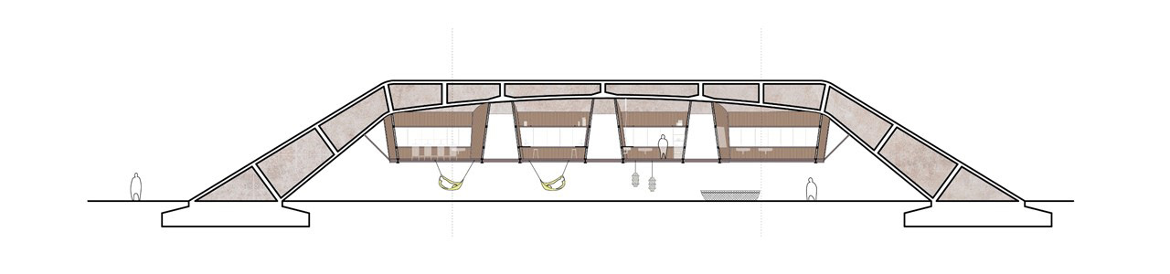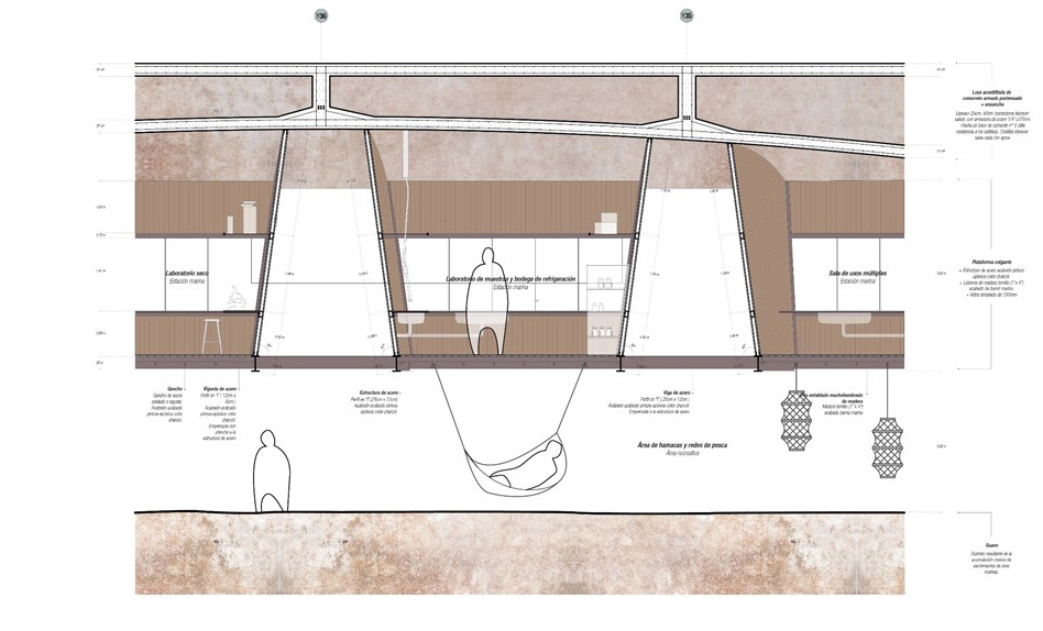 The proposal features two main types of spaces. Recreational areas are located on the ground floor and are defined by hanging furniture, creating an interactive experience with the environment. Meanwhile, enclosed spaces are placed on suspended platforms, housing an interpretation center, a marine station, and additional services.