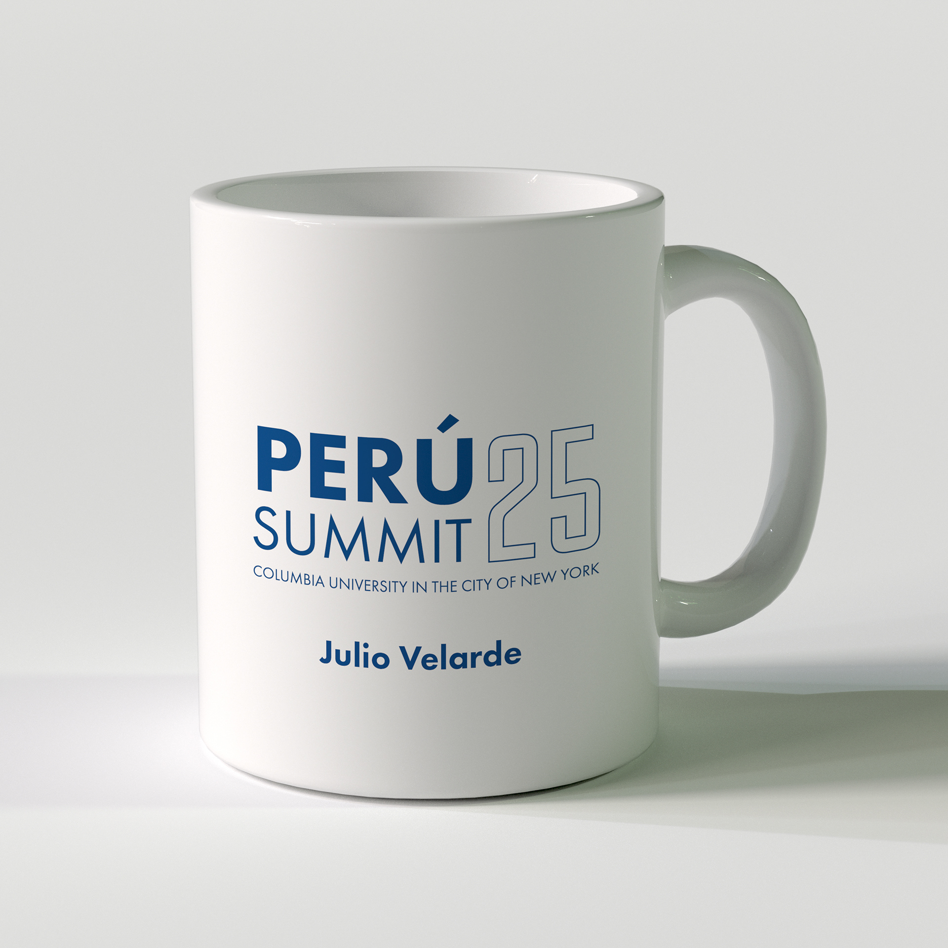 The logo and graphic line are set in a duotone palette based on Columbia University's official blues, reinforcing a sober and cohesive aesthetic while subtly evoking Peruvian heritage through geometric abstraction. The result is a visual identity that links institutional formality with cultural symbolism.